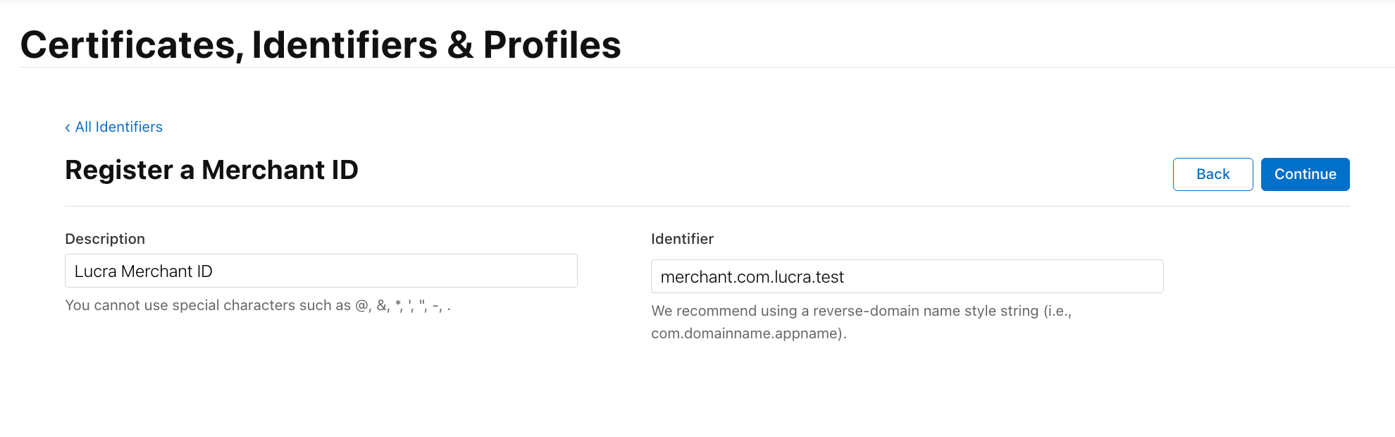 Identifierfield. TheDescriptionfield can have any label of your choosing. ClickContinue, confirm that the merchant ID was entered correctly and then clickRegister