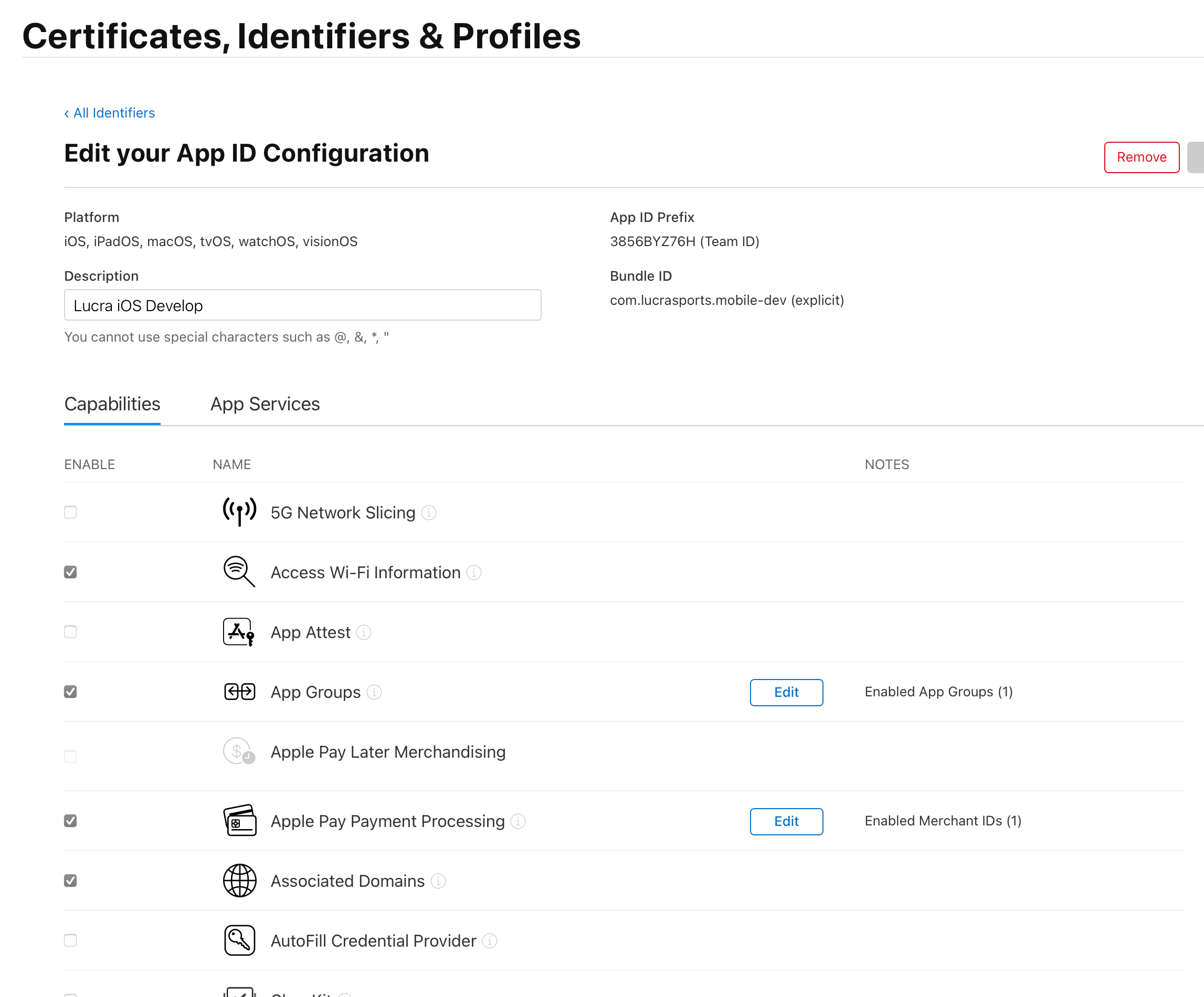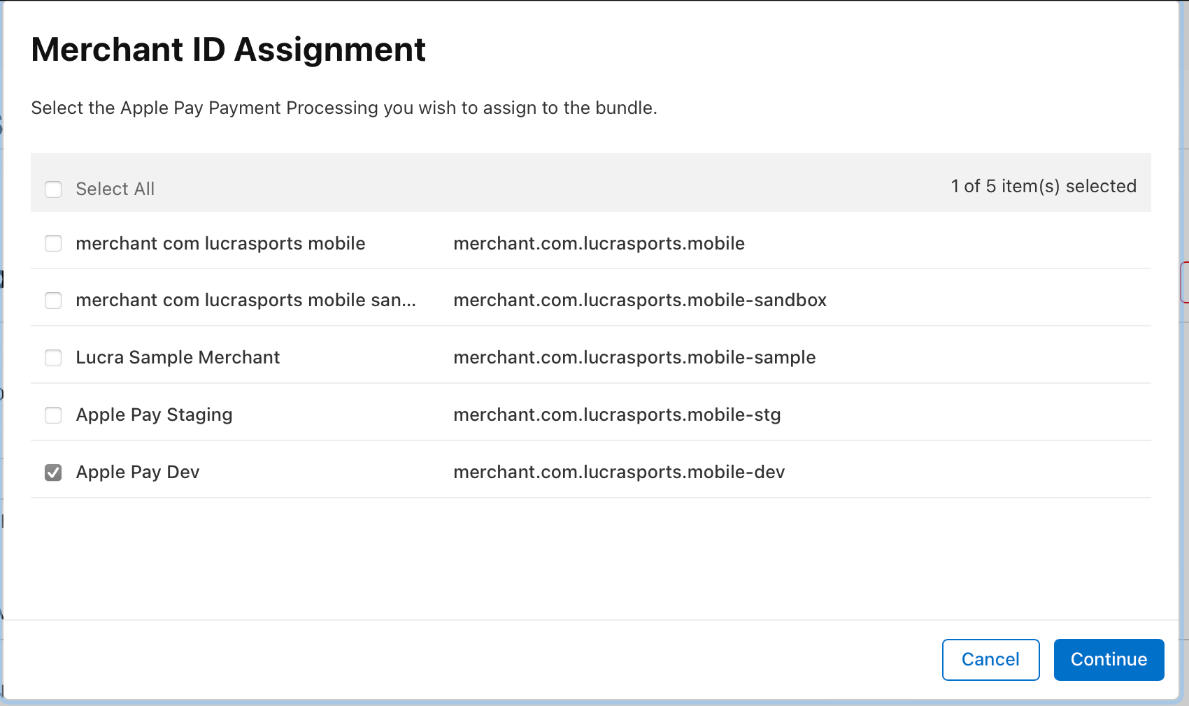 Assign the Merchant Identifier to your bundle ID by checking the box next to the Lucra Merchant Identifier (screenshot below).